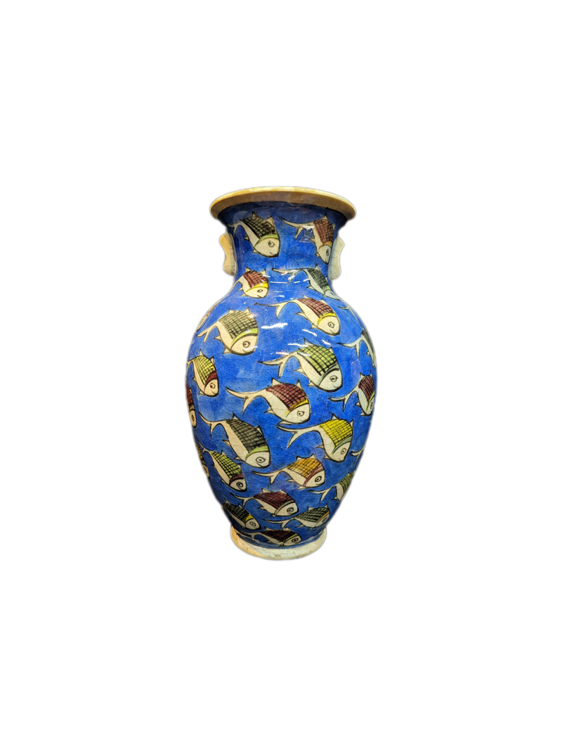 Questo splendido vaso persiano in ceramica colpisce immediatamente per il suo intenso sfondo blu, che funge da perfetto contrasto per i vivaci pesci stilizzati che lo decorano. Ogni pesce è dipinto a mano con dettagli minuziosi, caratterizzati da squame dai colori vibranti come giallo, rosso, verde e marrone, creando un senso di movimento e dinamismo che trasforma il vaso in un vero e proprio racconto visivo.