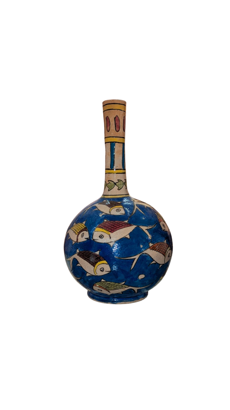 Raffinata anfora persiana in ceramica smaltata, realizzata e decorata interamente a mano. Il corpo globulare è arricchito da un vivace fondo blu con pesci stilizzati dai colori intensi, mentre il lungo collo svasato presenta eleganti motivi geometrici e floreali in giallo, rosso e verde. Questo pezzo fonde armoniosamente simbolismo marino e geometria persiana, evocando la tradizione artigianale iraniana in tutta la sua eleganza.