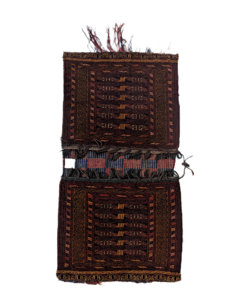 Il design centrale è arricchito da motivi geometrici tribali, con elementi rettangolari ripetuti che simboleggiano protezione e abbondanza. I dettagli intricati delle cornici, realizzati con maestria artigianale, completano la composizione con un equilibrio armonioso. La fascia centrale con accenti a righe aggiunge un tocco di dinamicità, esaltando la funzionalità originale di questa bisaccia.