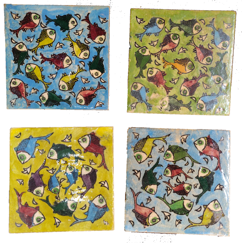 Ogni piastrella è disponibile in tonalità dominanti diverse – dal blu intenso al verde naturale, passando per il giallo brillante – che fungono da sfondo per i pesci in rosso, viola, verde e blu. La varietà cromatica e l’armonia del design rendono ogni pezzo unico e affascinante, espressione autentica della cultura persiana.