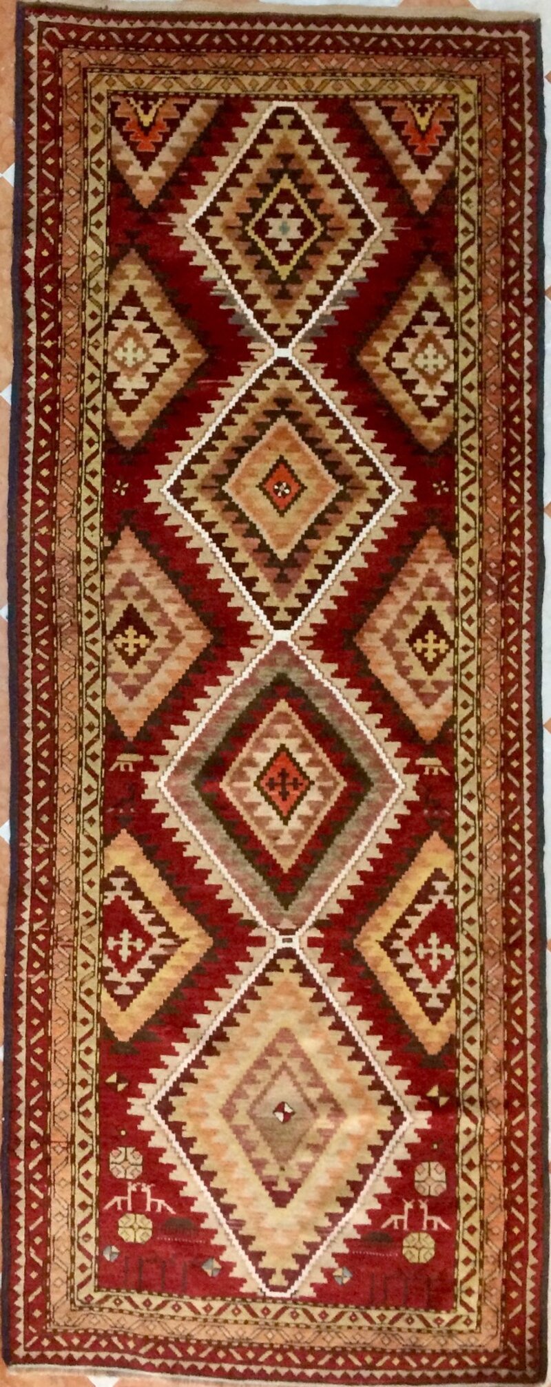 Il Tappeto Caucasico Daghistan (264x106 cm) è un esempio straordinario di artigianato tradizionale, proveniente dalla regione del Caucaso. Questo tappeto è caratterizzato da una composizione geometrica ricca e vivace, in cui spiccano una serie di rombi concentrici disposti lungo l'asse centrale. I colori dominanti includono tonalità di rosso caldo, marrone terra e avorio, con dettagli di verde e arancione che arricchiscono il design.