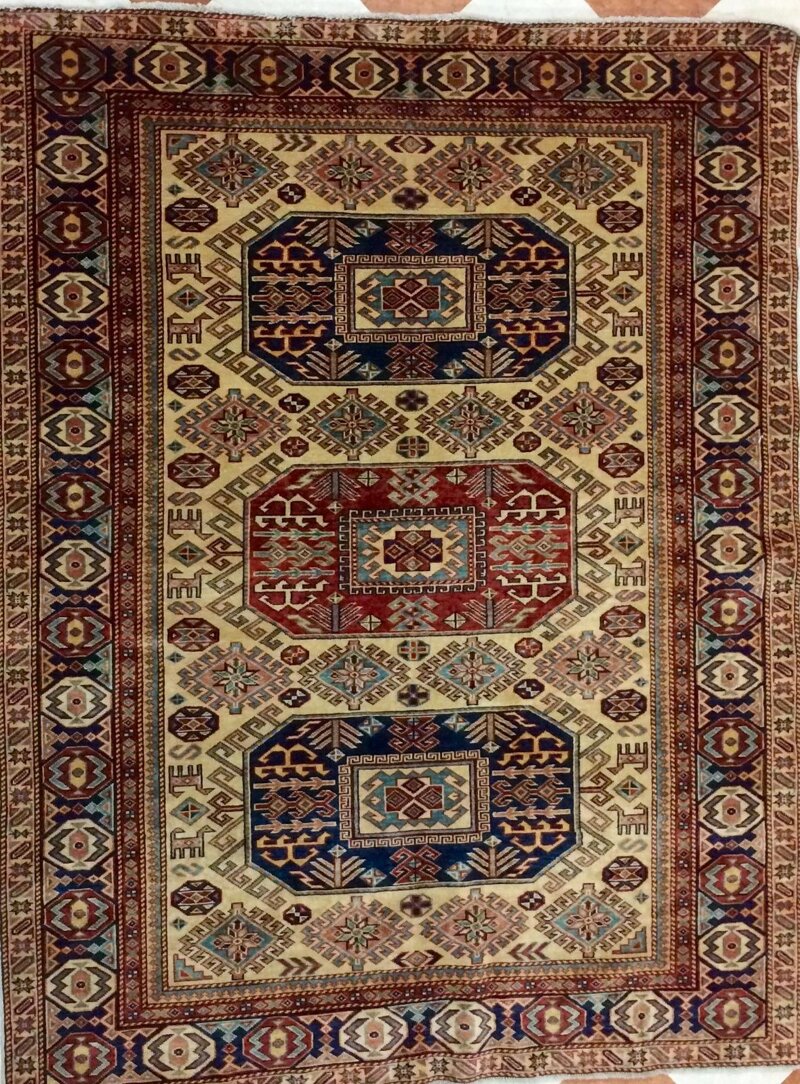Questo tappeto proveniente dal Pakistan rappresenta un'elegante interpretazione dello stile Shirwan caucasico, con una dimensione di 186x146 cm. Il suo design richiama l'arte tradizionale caucasica, caratterizzata da una combinazione armoniosa di motivi geometrici e floreali, che si intrecciano in un equilibrio perfetto.