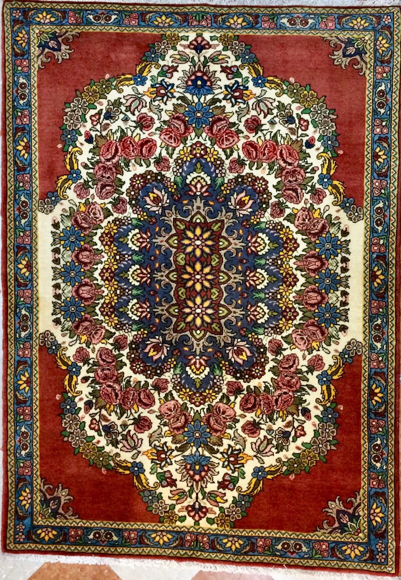 Questo splendido tappeto persiano della tipologia Bakhtiari, con dimensioni di 148x108 cm, rappresenta un raffinato esempio della tradizione tessile persiana. Il disegno è dominato da un sontuoso medaglione centrale, ricco di dettagli floreali e ornamenti geometrici, incorniciato da motivi floreali che si estendono armoniosamente su tutta la superficie. Le tonalità vibranti di rosso, avorio e blu intenso creano un equilibrio cromatico che esalta la bellezza dei dettagli artistici.