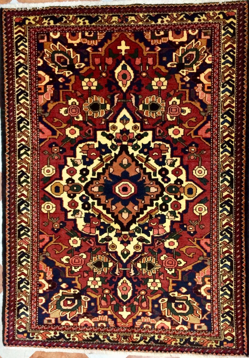 Questo raffinato tappeto persiano della tipologia Bakhtiari, con dimensioni di 154x110 cm, rappresenta un'opera d'arte tessile senza tempo. Caratterizzato da un elaborato medaglione centrale che domina la composizione, il design è arricchito da dettagli floreali e geometrici che si intrecciano armoniosamente lungo tutto il tappeto. I colori vibranti, come il rosso intenso, l'avorio luminoso e il blu profondo, creano un effetto visivo di grande impatto.