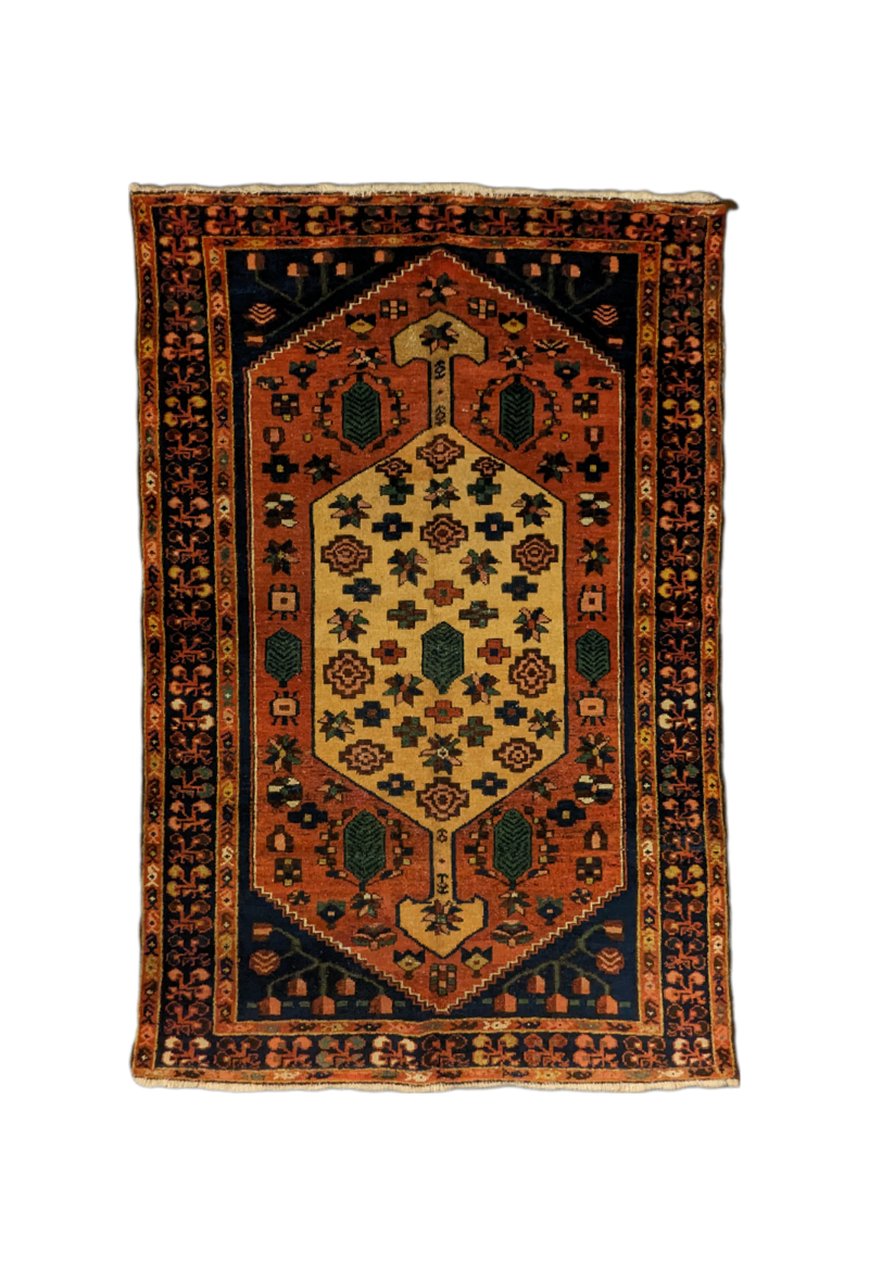 Il tappeto persiano Bakhtiari (190x128 cm) è un autentico capolavoro dell'arte tessile tradizionale. Questo tappeto si distingue per il suo design geometrico unico, dominato da un grande medaglione centrale dai colori caldi e ricchi, come l'arancione, il beige, il verde e il blu profondo. I motivi floreali e vegetali stilizzati si intrecciano armoniosamente, raccontando la storia della maestria artigianale persiana.
