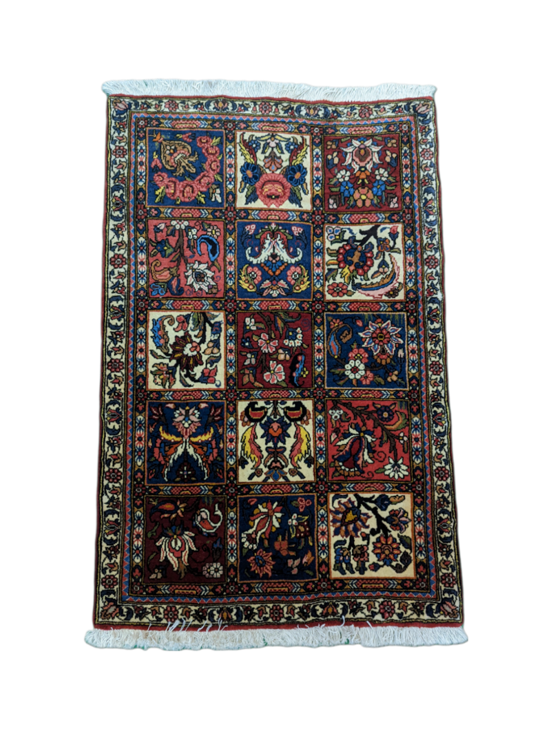 Il tappeto persiano Bakhtiari (98x63 cm) è una splendida testimonianza della tradizione artigianale persiana. Caratterizzato da un design a pannelli, presenta una serie di motivi floreali e animali intricati, ognuno dei quali è un'opera d'arte in miniatura. Le tonalità vivaci di rosso, blu navy, avorio e accenti di verde e oro si combinano armoniosamente, creando un effetto visivo ricco e affascinante.