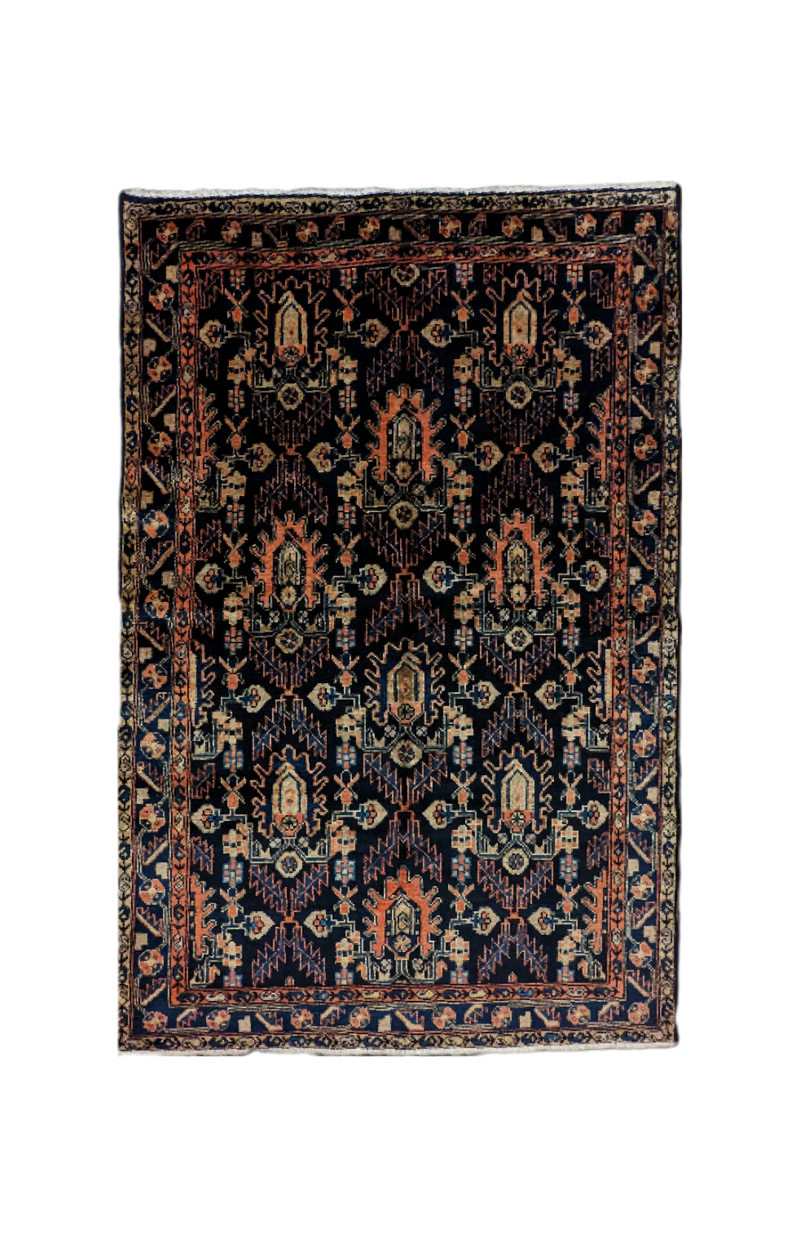 Il tappeto persiano Burujerd (198x130 cm) rappresenta un raffinato esempio dell'arte tessile persiana, caratterizzato da una straordinaria armonia tra design geometrico e motivi tradizionali. Questo tappeto presenta un fondo blu scuro riccamente decorato con motivi ripetuti di medaglioni stilizzati e dettagli floreali, impreziositi da tonalità di arancione bruciato, avorio e verde tenue.