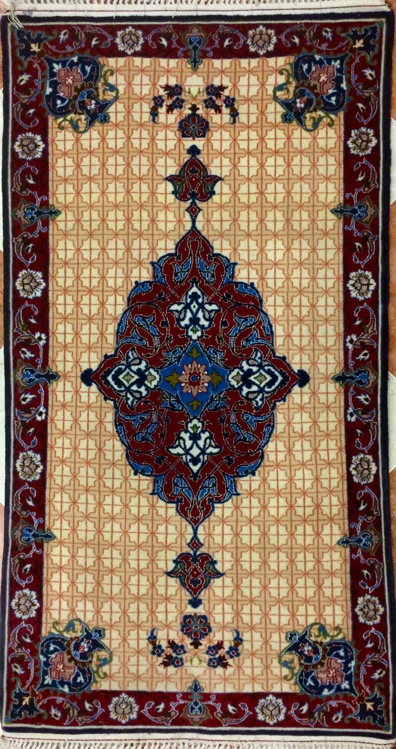 Il motivo centrale è caratterizzato da un medaglione intricatamente decorato, con dettagli floreali e arabeschi che emergono su uno sfondo dai toni chiari, arricchito da un pattern geometrico delicato. La cornice rossa intensa con decorazioni floreali offre un contrasto armonioso, esaltando la bellezza dell'intero disegno. Questo tappeto è il risultato di una lavorazione meticolosa e rappresenta un’aggiunta di pregio per chi cerca un pezzo autentico e ricco di tradizione.
