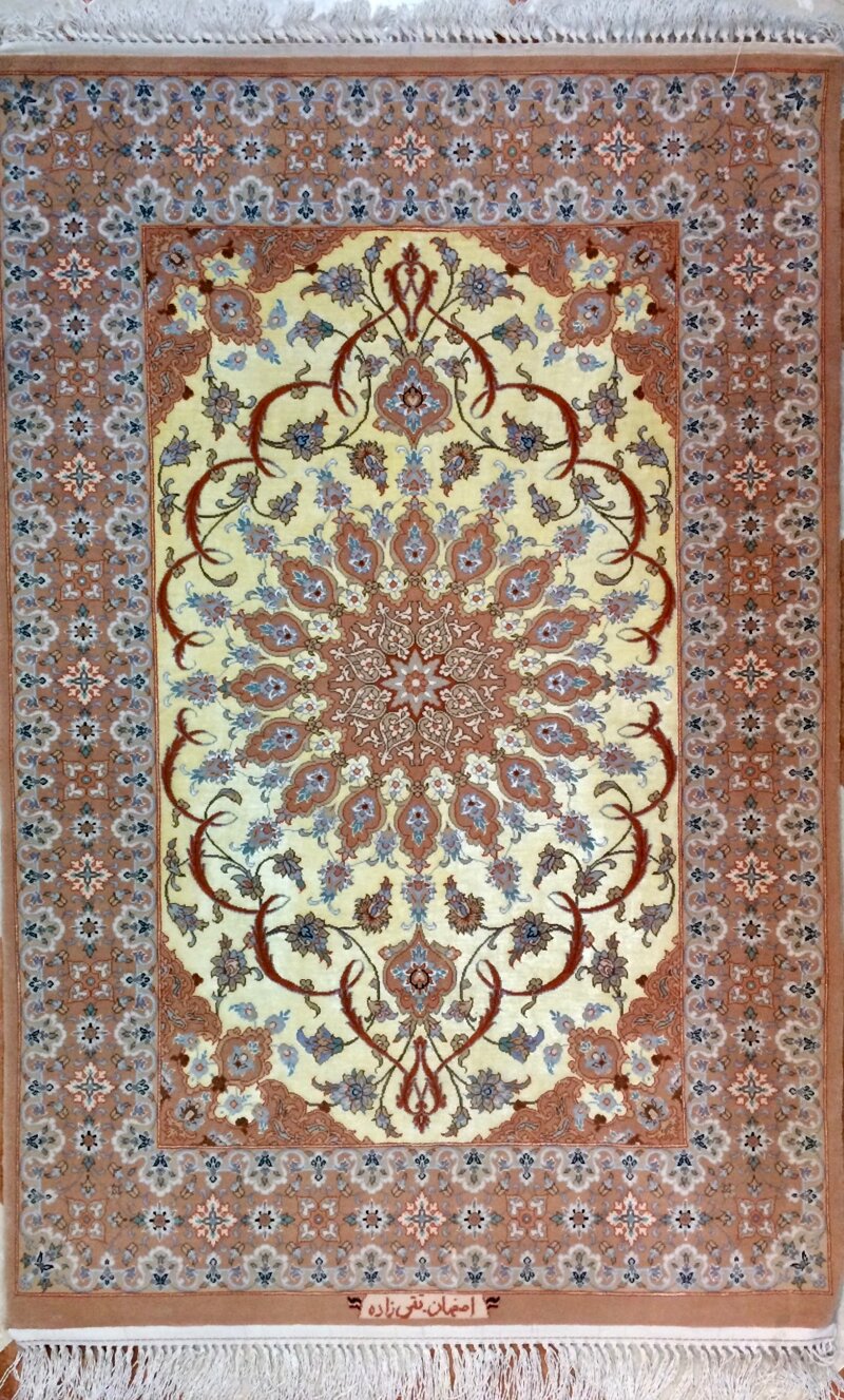 Il tappeto Isfahan che hai presentato rappresenta un autentico esempio dell'eleganza e della maestria artigianale persiana. Con misure di 124x82 cm, si distingue per la sua trama e ordito in seta, che donano al pezzo una straordinaria lucentezza e morbidezza al tatto. Il motivo centrale si sviluppa armoniosamente con dettagli intricati e floreali, simbolo della ricca tradizione decorativa della città di Isfahan.