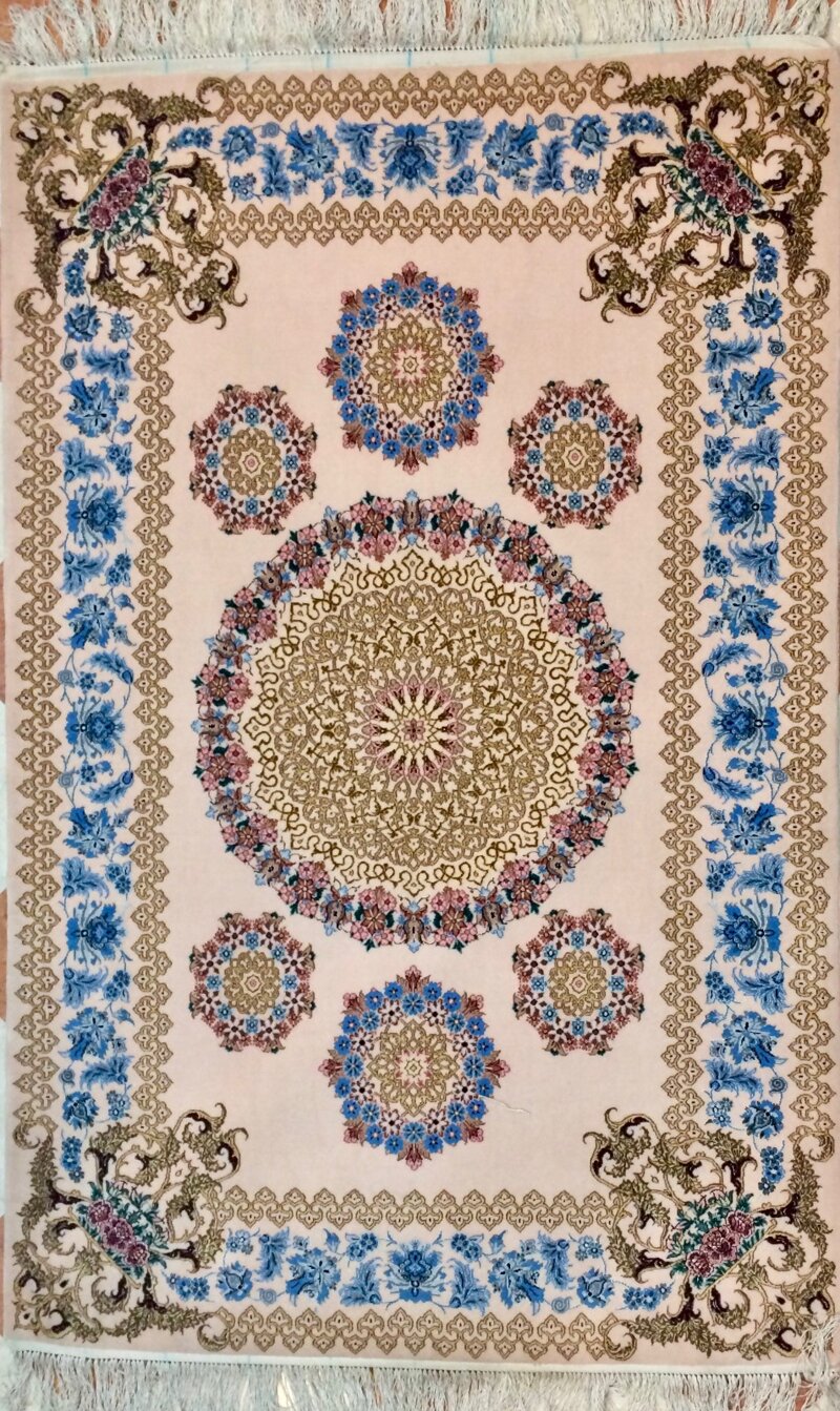 Il design centrale, un elaborato medaglione floreale, è circondato da intricate decorazioni di motivi vegetali e geometrici che richiamano la tradizione classica persiana. La cornice, caratterizzata da una sinfonia di toni azzurri e dorati, crea un armonioso contrasto con lo sfondo chiaro, accentuando la bellezza dell'intero disegno.