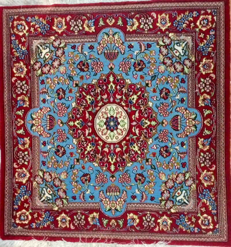 Questo splendido tappeto persiano di tipo Kum, con dimensioni di 108x103 cm, è un vero gioiello dell'arte tessile iraniana. Il design, riccamente decorato, si caratterizza per un medaglione centrale intricatamente lavorato, circondato da motivi floreali simmetrici e arabeschi che si sviluppano con grazia su uno sfondo azzurro chiaro, evocando eleganza e armonia.