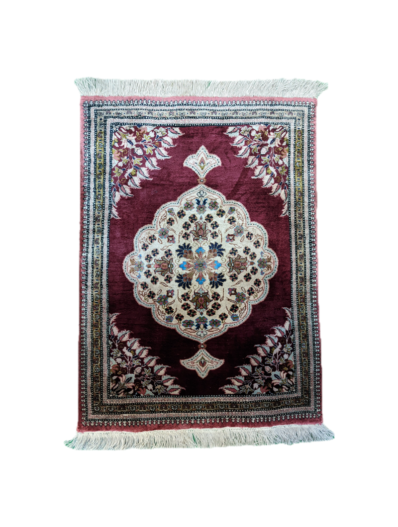 Il tappeto persiano Kum Seta (80x50 cm) è un raffinato esempio di artigianato tessile, realizzato interamente in seta e caratterizzato da un design elegante e sofisticato. Il medaglione centrale, di forma elaborata, è incorniciato da un fondo color borgogna che esalta la lucentezza naturale della seta, creando un contrasto armonioso con i motivi floreali riccamente decorati.