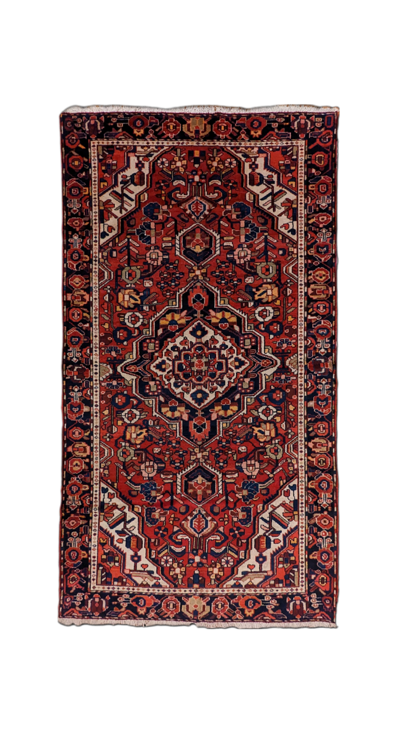 Il tappeto persiano Malayer (216x119 cm) è un esempio straordinario dell'eleganza e della tradizione tessile persiana. Questo tappeto presenta un design complesso, dominato da un medaglione centrale geometrico, arricchito da motivi floreali e dettagli stilizzati che si intrecciano armoniosamente su uno sfondo di tonalità rosso intenso.