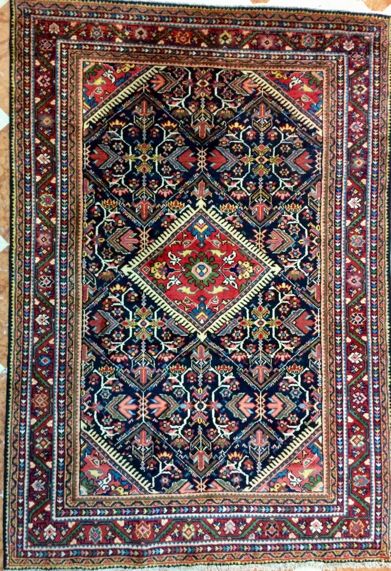 Questo tappeto persiano di tipo Muskabad, dalle dimensioni di 195x135 cm, è un magnifico esempio della tradizione artigianale persiana. Caratterizzato da un medaglione centrale di forma romboidale, il disegno presenta una complessa trama di motivi floreali e geometrici che si sviluppano armoniosamente su uno sfondo blu intenso.