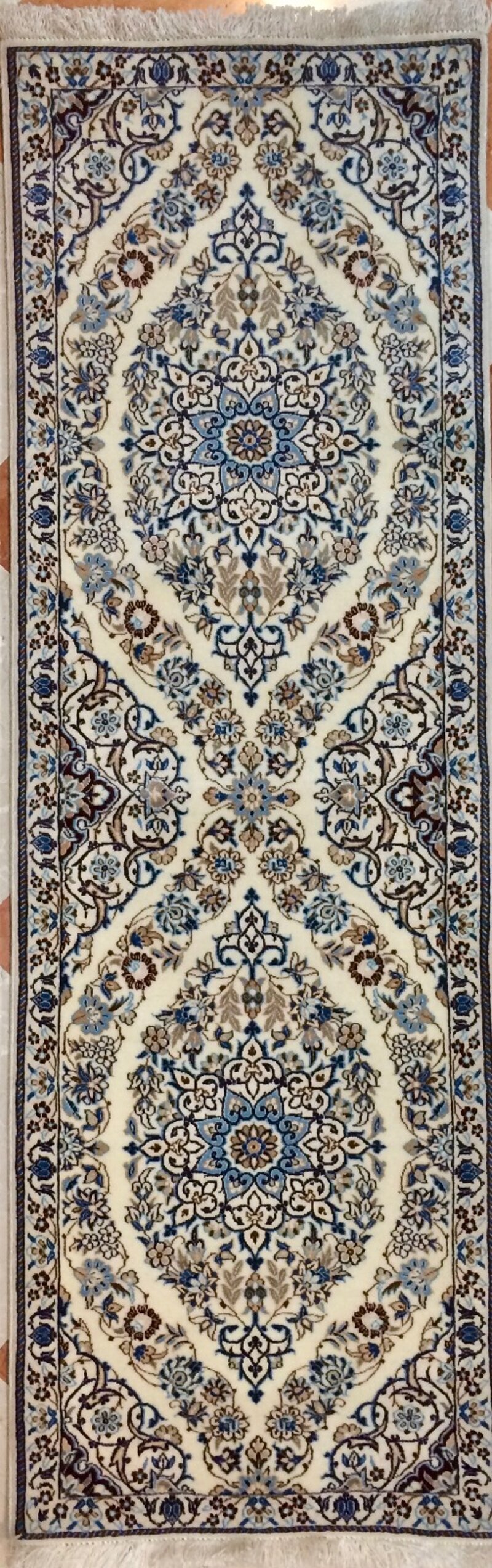 Perfetto come passatoia per corridoi eleganti o per arricchire piccoli spazi con un tocco di lusso, questo tappeto Nain 6La è un'opera d'arte che unisce bellezza, qualità e tradizione, ideale per ambienti sofisticati e di classe.