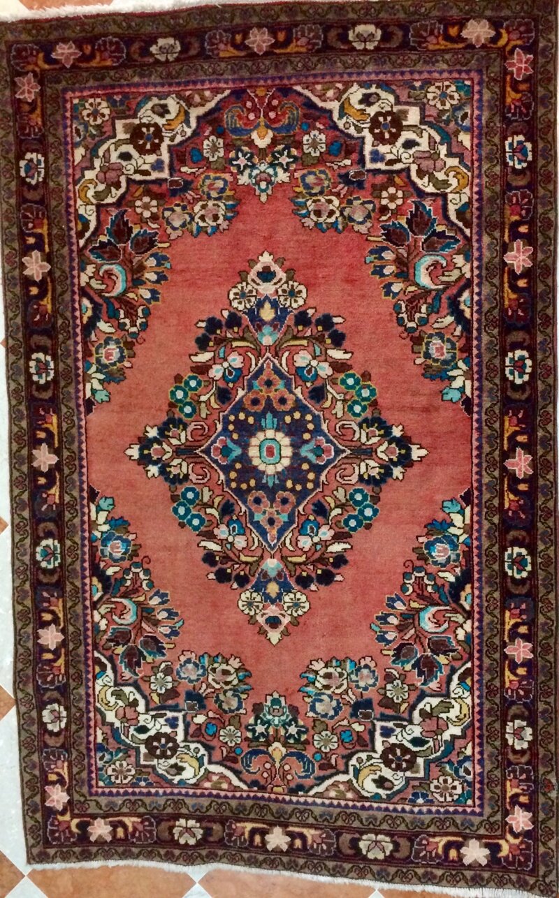 Il tappeto è caratterizzato da un fondo in tonalità calda di rosso, decorato con un ricco medaglione centrale in blu, avorio e accenti verde acqua. Il motivo floreale, ricco di dettagli, si estende armoniosamente fino ai bordi, incorniciati da una fascia decorativa con intricati motivi floreali e geometrici che conferiscono un equilibrio perfetto al design complessivo.