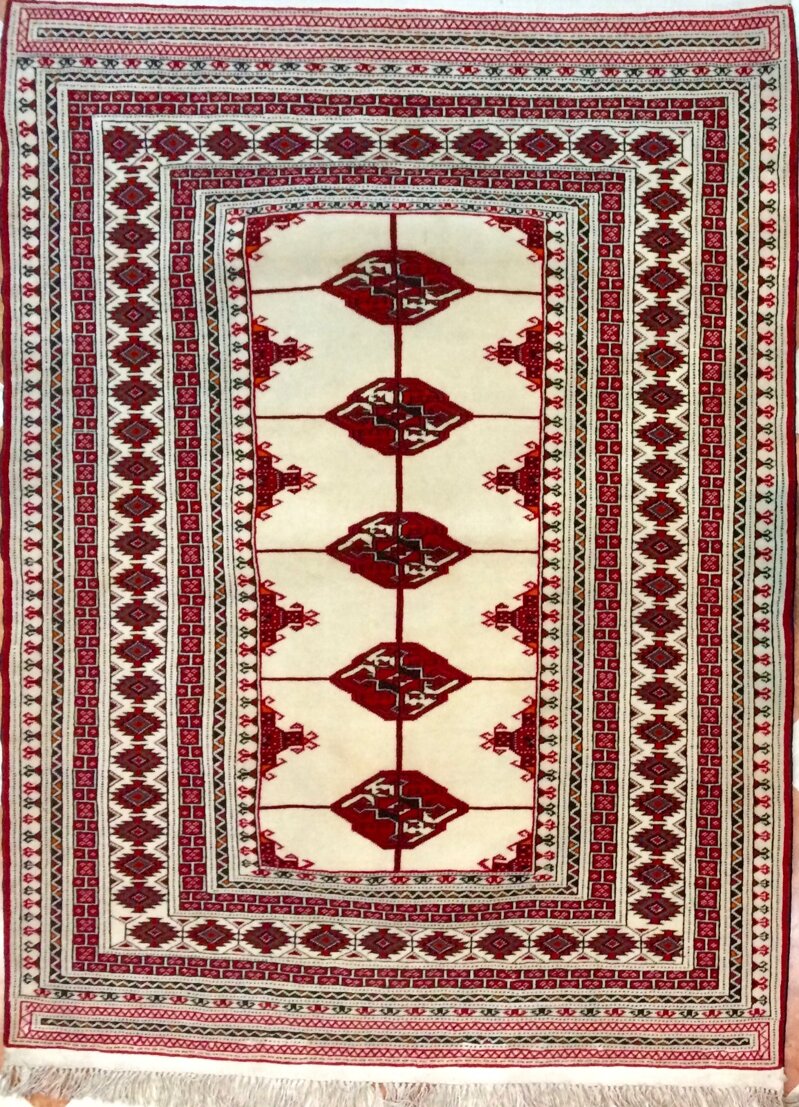 Il design è dominato da un fondo avorio chiaro decorato con il classico motivo geometrico "Gul" in tonalità di rosso intenso, tipico dei tappeti Turkmeni. I bordi sono arricchiti da intricate cornici con dettagli simmetrici, che aggiungono profondità e definizione al tappeto senza appesantirne l'aspetto.