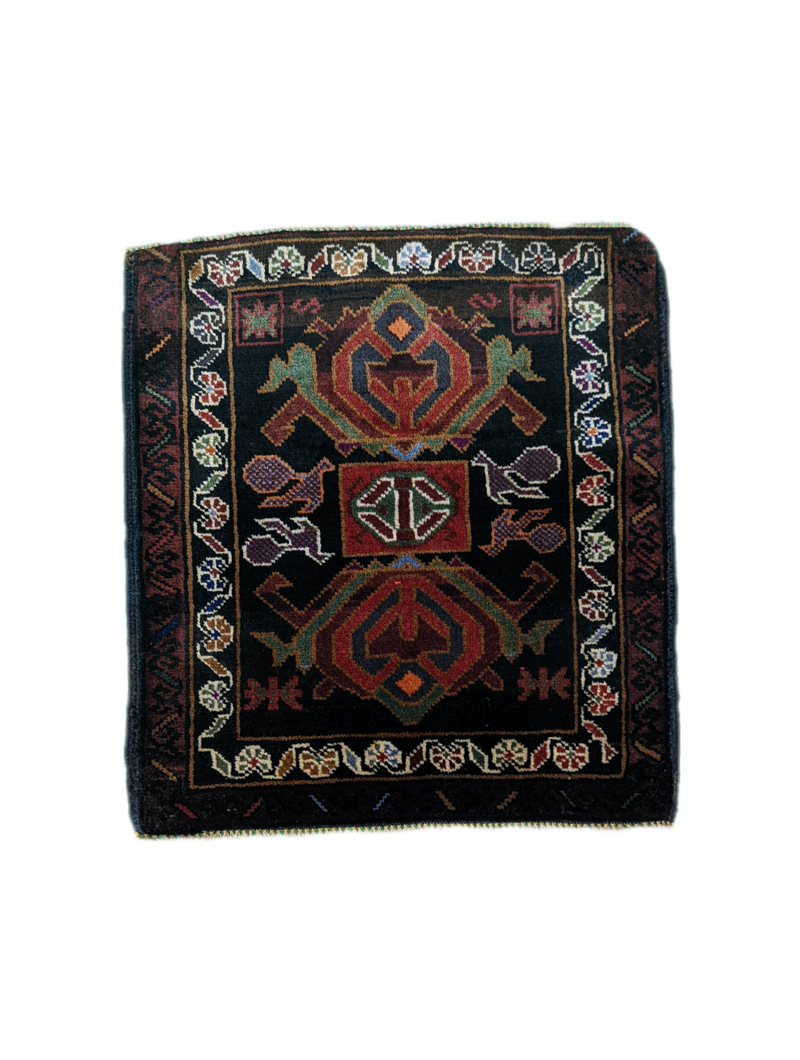 Il tappeto Turkmeno (56x51 cm) è un affascinante esempio della tradizione tessile dell'Asia Centrale, noto per il suo design geometrico e i motivi simbolici che richiamano le radici nomadi di questa regione. Questo tappeto presenta un disegno centrale audace con figure stilizzate e motivi tribali, circondato da una cornice intricata ornata da elementi floreali e simbolici.