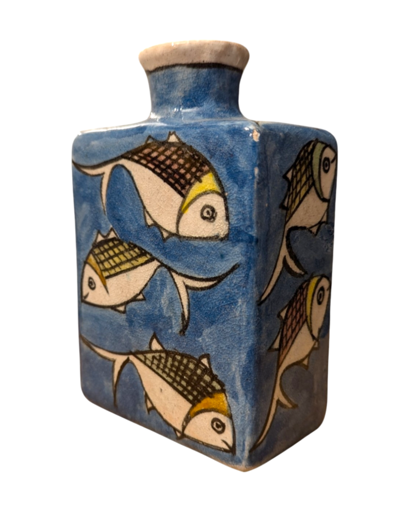 Questo splendido vaso in ceramica persiana, dalla forma rettangolare e proporzioni armoniose, è una celebrazione dell’arte e della tradizione orientale. Realizzato e dipinto a mano, il pezzo si distingue per il suo fondo blu marino intenso, che richiama la calma e la profondità delle acque.