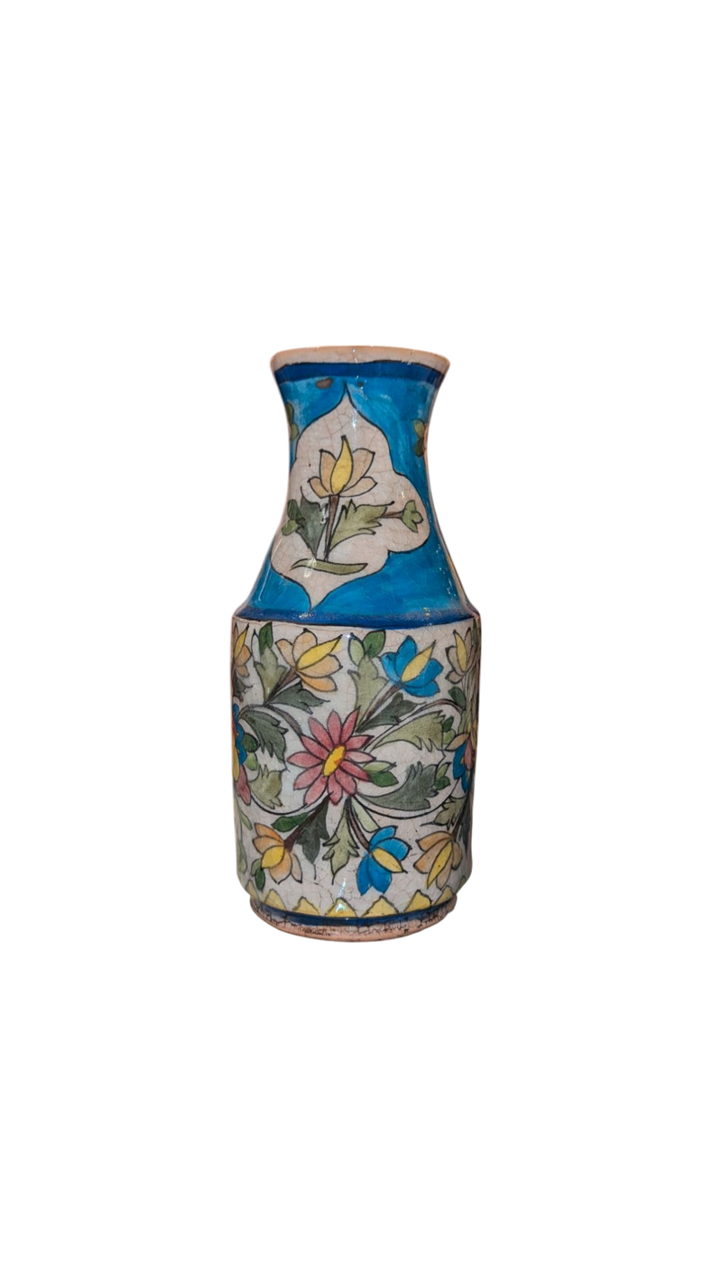 Elegante vaso persiano in ceramica smaltata, interamente decorato a mano con uno stile raffinato e luminoso. Il corpo è rivestito da una fitta composizione di fiori stilizzati dai colori vivaci – rosa, giallo, blu, verde – su fondo bianco avorio, mentre il collo presenta una cornice turchese con motivi floreali incorniciati. L’armonia delle forme e la delicatezza cromatica richiamano le tradizionali miniature e l’arte floreale di Isfahan.