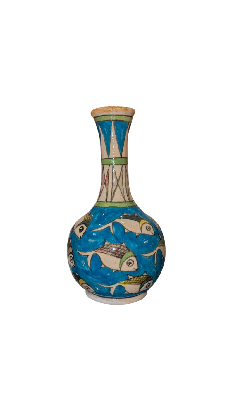 Elegante vaso persiano realizzato a mano in ceramica, decorato con un vivace fondo blu. I pesci stilizzati, simboli tradizionali di abbondanza e vita, si muovono armoniosamente intorno al corpo del vaso, esprimendo la ricchezza cromatica e narrativa dell'arte ceramica iraniana. Il collo lungo e affusolato è arricchito da motivi geometrici in toni turchesi e verde oliva, tipici dello stile decorativo del centro dell’Iran.