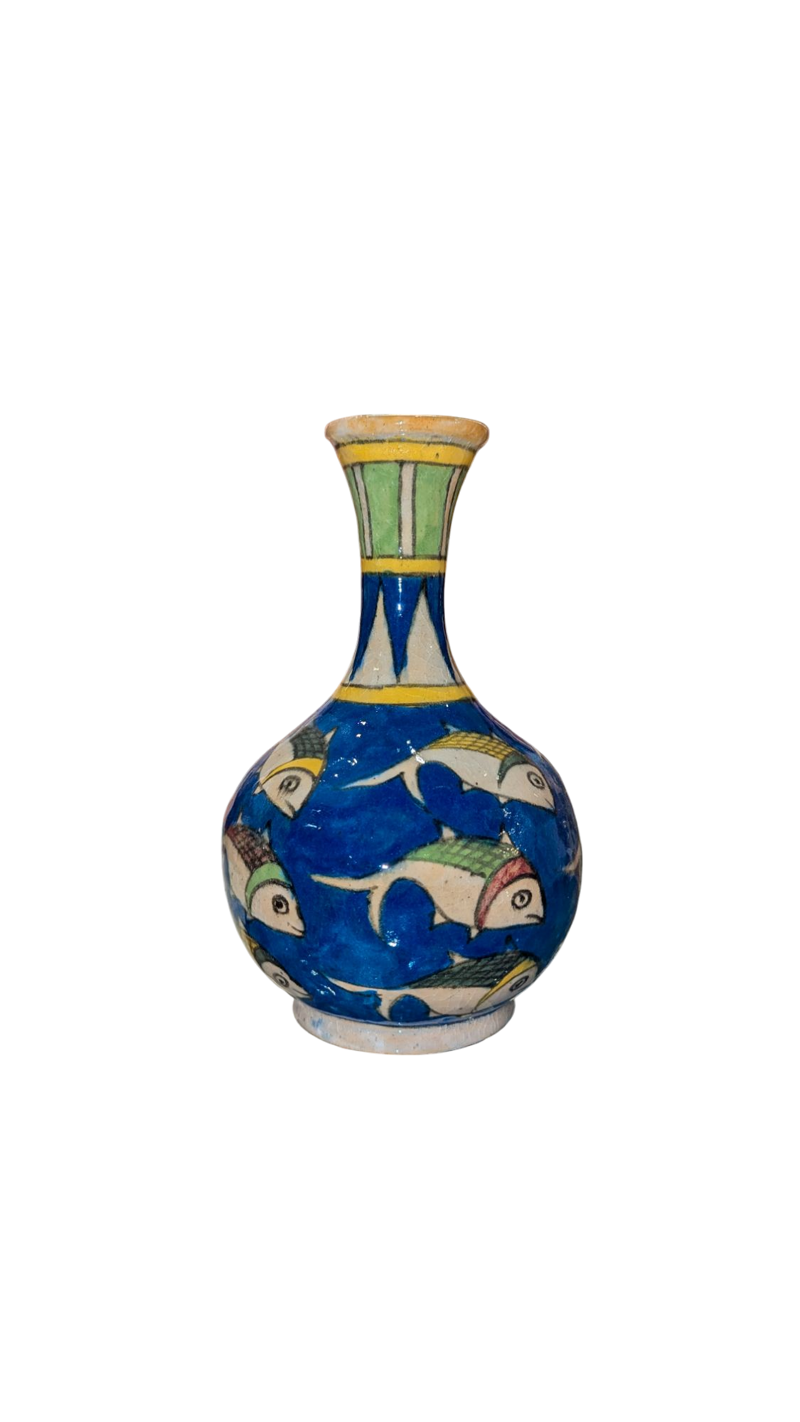 Raffinato vaso persiano in ceramica dipinta a mano, caratterizzato da un fondo blu intenso decorato con pesci stilizzati in movimento. L’alternanza di colori vivaci come il verde, il giallo e il rosso sulle squame crea un effetto dinamico e armonioso, simbolo della vitalità e dell’abbondanza nella cultura iraniana. Il collo, slanciato e impreziosito da motivi geometrici verticali in verde e avorio, è incorniciato da linee gialle che richiamano l’equilibrio delle forme classiche persiane.