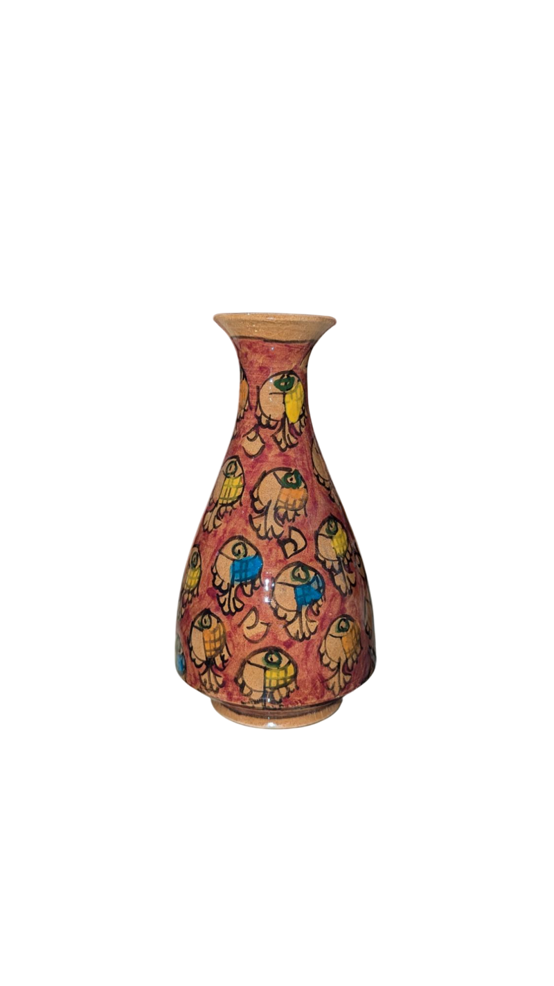 Originale vaso persiano in ceramica dipinta a mano, caratterizzato da un fondo rosso intenso e una decorazione ricorrente di pesci stilizzati dagli occhi grandi. I colori caldi e accesi – giallo, turchese, verde e arancio – donano energia alla composizione, mentre la forma slanciata richiama le tradizioni ceramiche dell’altopiano iranico. Un pezzo unico che fonde arte popolare e simbolismo antico, perfetto per ambienti contemporanei o etnici.