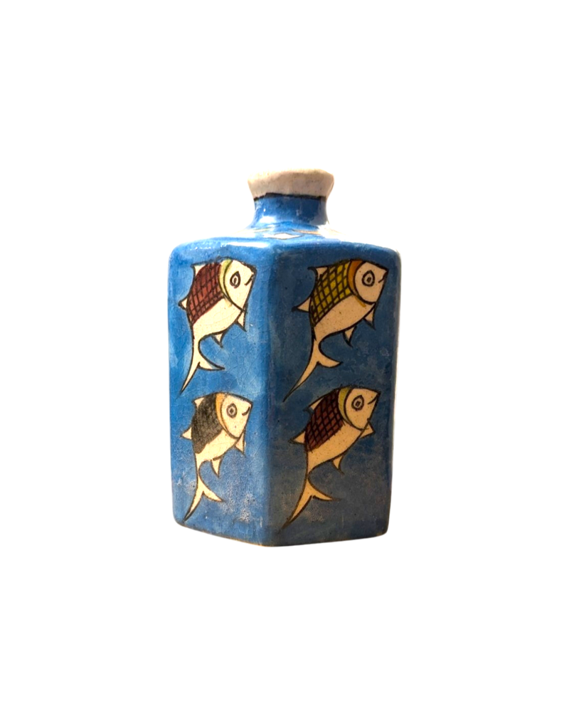 Questo elegante vaso in ceramica, dalla caratteristica forma esagonale, rappresenta un perfetto esempio della tradizione artistica persiana. Dipinto interamente a mano, il suo intenso fondo blu crea un’atmosfera suggestiva che evoca le profondità marine, enfatizzando il raffinato motivo decorativo.