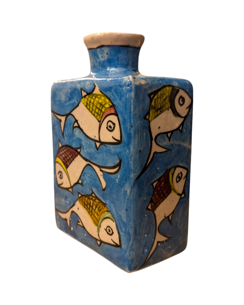 Il motivo decorativo presenta una danza di pesci stilizzati, realizzati con colori caldi e dettagli unici che riflettono la maestria degli artigiani. Le sfumature di giallo, rosso e verde dei pesci si fondono armoniosamente con lo sfondo blu, creando un contrasto cromatico di grande impatto visivo.