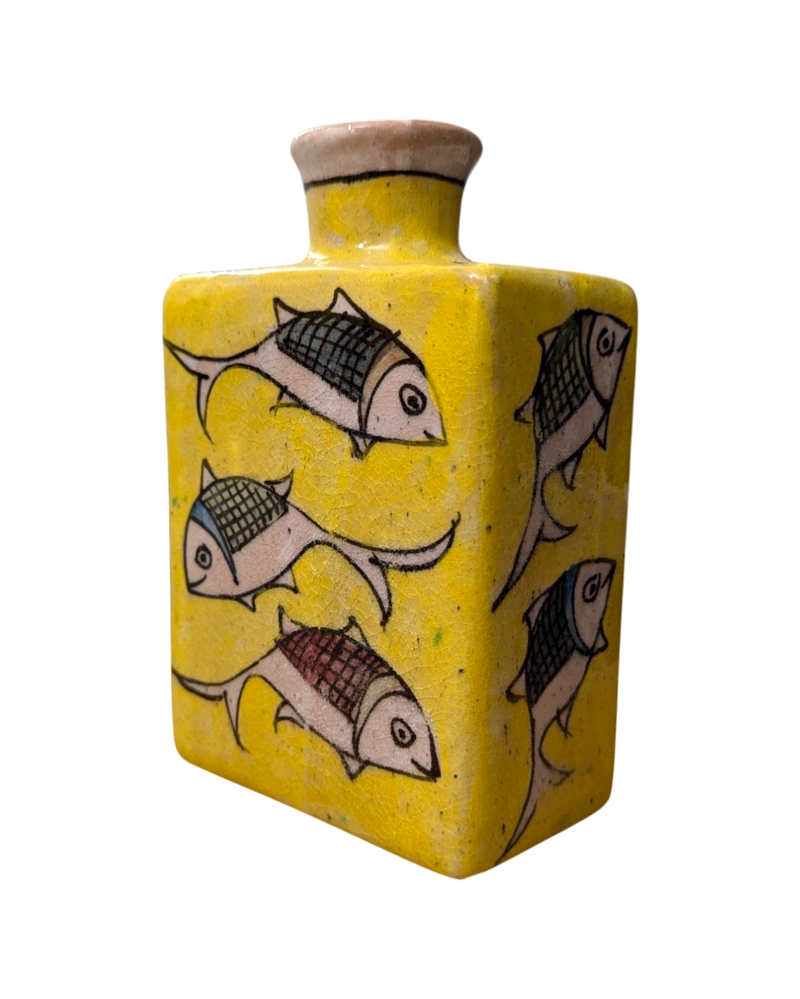 Il motivo principale è costituito da eleganti pesci stilizzati, ognuno arricchito da dettagli cromatici che spaziano dal verde al blu e al rosso, in un gioco armonioso di contrasti. Le linee fluide e il design essenziale catturano il movimento delle creature marine, rendendo questo vaso un'opera d'arte senza tempo.